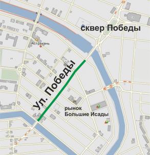 Улица Победы является осевой дорогой микрорайона, прилегающего к рынку «Большие Исады», и участок при небольшой протяженности, всего 550 метров, всегда загружен. Его пересекают восемь улиц. Отрезок соединен двумя мостами - Троицким и Победы. Здесь находятся мечеть Махмуда Эфенди и приход Успения Пресвятой Богородицы Римско-Католической церкви. Также по этой улице можно добраться к крупнейшим торговым площадкам Астрахани.