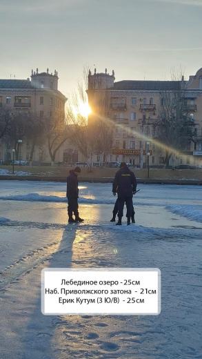 Так, толщина льда на Лебедином озере и ерике Кутум в микрорайоне 3-й Юго-восток составляет 25 сантиметров, а на Варвациевском канале - 21 сантиметр. Несмотря на такие показатели, по словам специалистов, массовый выход на лёд опасен, поскольку из-за частых перепадов температур он потерял прочность.